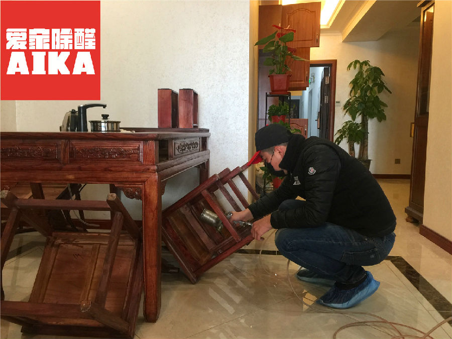 樊先生家的家具主要以購置的實木家具和自己定做的木質家具為主,因為剛剛裝修結束不久,感官上味道非常大,我們為其制定了專項的除甲醛方案,針對房間內的所有污染源進行專項治理。