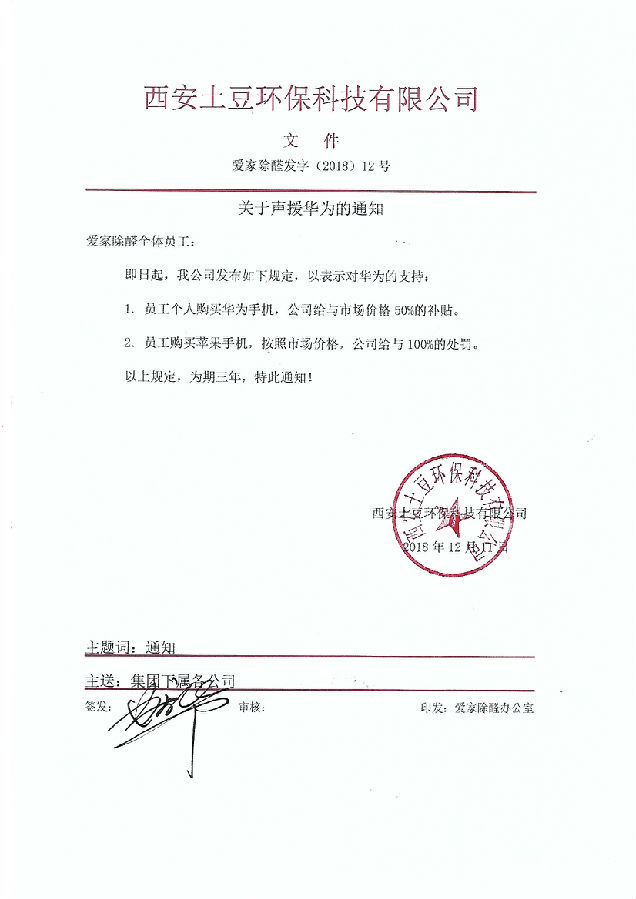 愛家除醛發通知聲援華為:員工買蘋果手機將處罰。員工購買華為手機,公司給予50%補貼。若員工購買蘋果手機將被處罰。