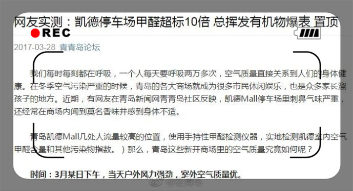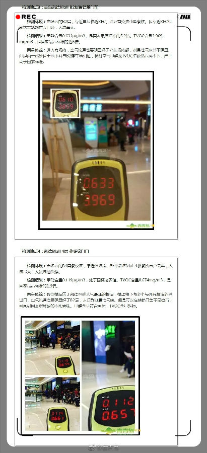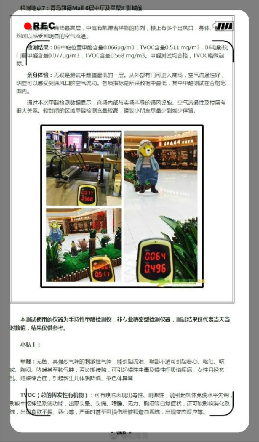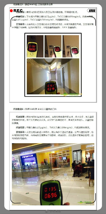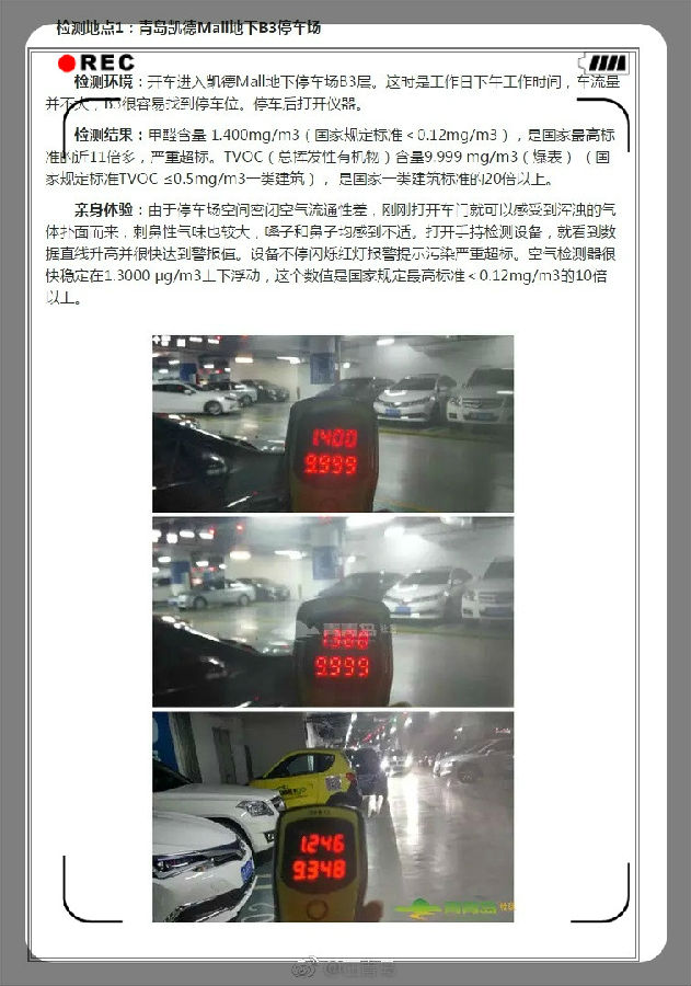 【網(wǎng)友實測:凱德停車場甲醛超標10倍 總揮發(fā)有機物爆表】近期,有網(wǎng)友在青島新聞網(wǎng)青青島社區(qū)反映,凱德Mall停車場里刺鼻氣味嚴重,還經(jīng)常在商場內(nèi)聞到莫名香味并感到身體不適。青島凱德Mall幾處人流量較高的位置,使用手持性甲醛檢測儀器,實地檢測凱德室內(nèi)空氣甲醛含量和其他污染物指數(shù)。)那么,青島這些新開商場里的空氣質(zhì)量究竟如何呢?
